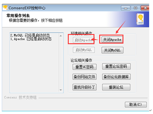 设置完后,必须要 重启apache,域名设置才能生效;桌面打开discuz套件的快捷按钮,弹出此界面,先关闭apache,然后在点击启动即可。