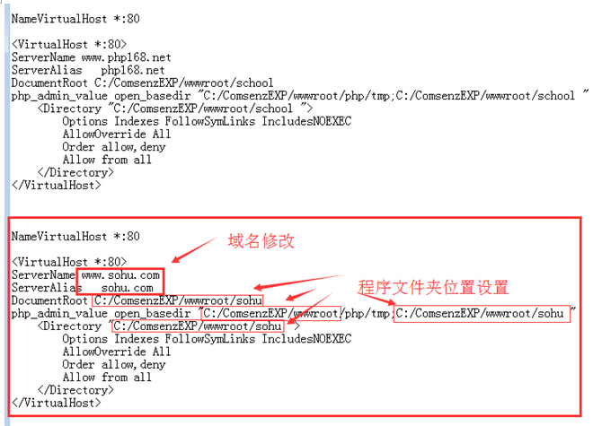B:同样在httpd-vhosts.conf文件夹中,我们复制一段出来,改下对应的域名和文件夹对应位置。就可以了;然后重启apache就生效了。 举一反三,如果再新增一个网站,你再复制一段,然后改下即可。
