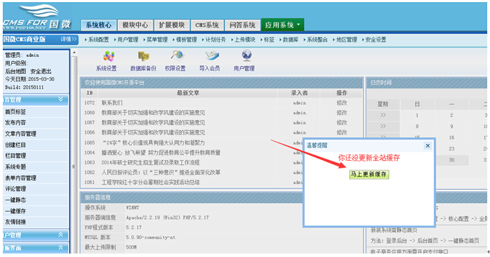 I、后台路径是admin.php如下;然后点击更新网站缓存