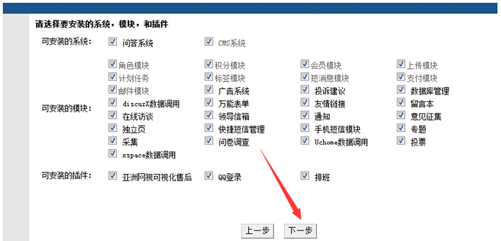 出现相关的安装环境提示,深黑色的地方必须打钩才能安装,如果里面 任意一项不支持,就会提示核心无法安装,从而无法安装网站。浅灰色的是可选的,不一定要支持。