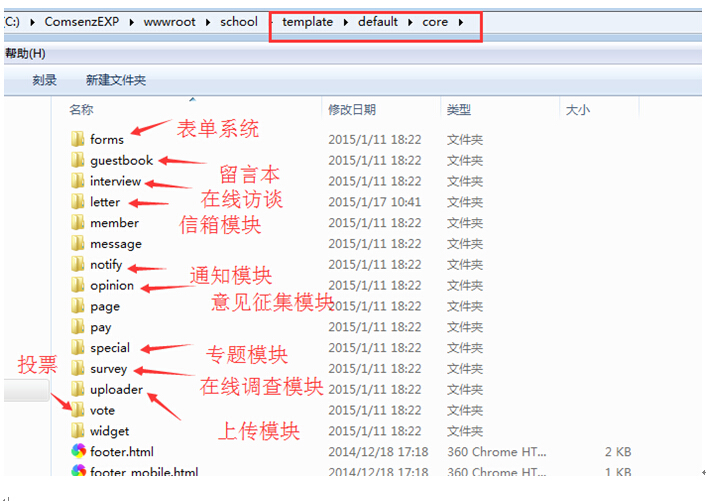 进入template---school01模板里面,core是核心模块模板文件夹,里面有主要存放公共头部和尾部,这个得记住。头尾部就是存放在此的。