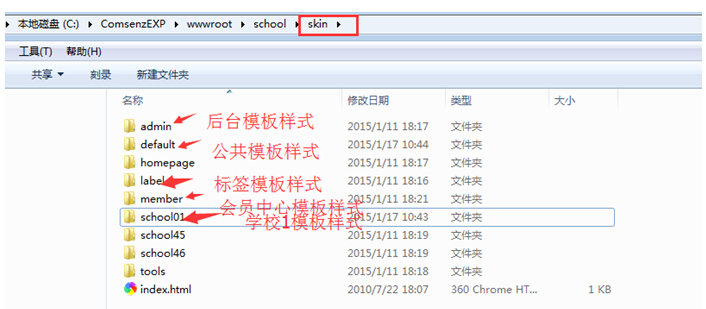 打开school目录---可以看到skin和template文件夹;所有模板均只与这两个模板文件夹有关,他的变动不影响程序的运行,只会影响模板样式。