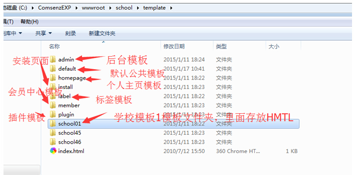 进入template(存放HTML模板的文件夹),里面有各种文件夹,可以了解下;一般我们只需关注所需的模板,如只需要关注school01模板,以及部分地方会涉及到公共模板default,其他一般不管。